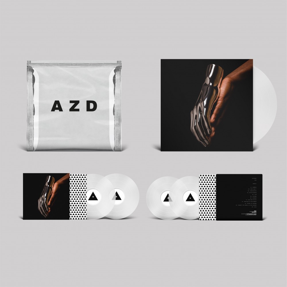 2LPX 2 x 12” clear vinyl in a spined sleeve housed within a chrome silver outer bag with AZD title screen-printed on top. |