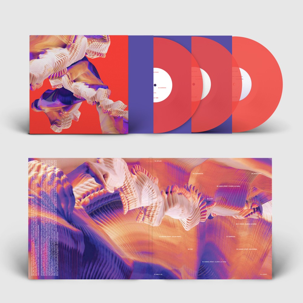 Deluxe 3LP 12” gatefold sleeve on Curious Matter, printed colour and Pantone, standard cover. 3 x 140g 12” neon orange transparent vinyl housed in purple paper inner sleeves. Download code included. |