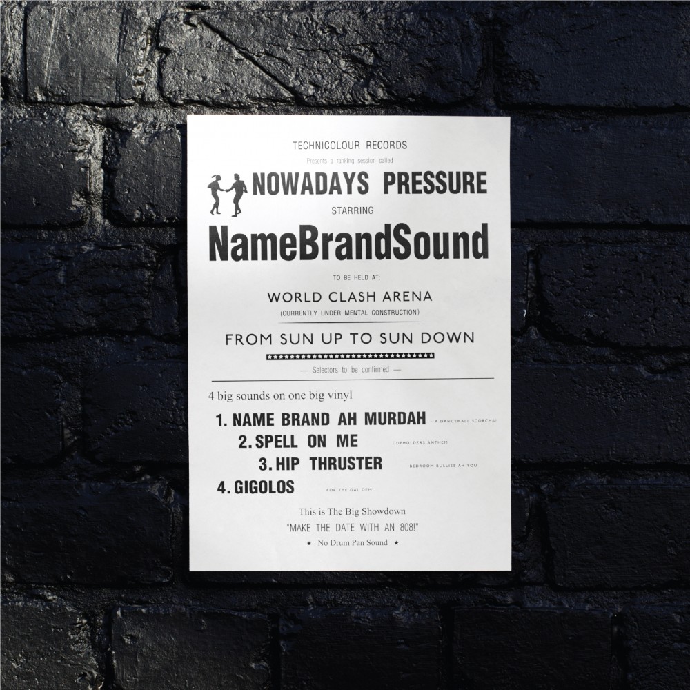 NameBrandSound’s music thus consists of the influences you might expect; dancehall, ‘80s soul, jungle, juke and house. What emerges, though, is more than the sum of its parts. Nowadays Pressure is a hugely refreshing, invigorated EP of electronic songs. Heavy and light, pummelling and caressing, emotive and tough, this is the sound of masters at work. The pair dub the sound ‘pressure;’ a rough meets smooth aesthetic that injects London’s bass music energy to the spirit of Metalheadz’ D’n’B-with-feeling and Massive Attack’s infectious mood.